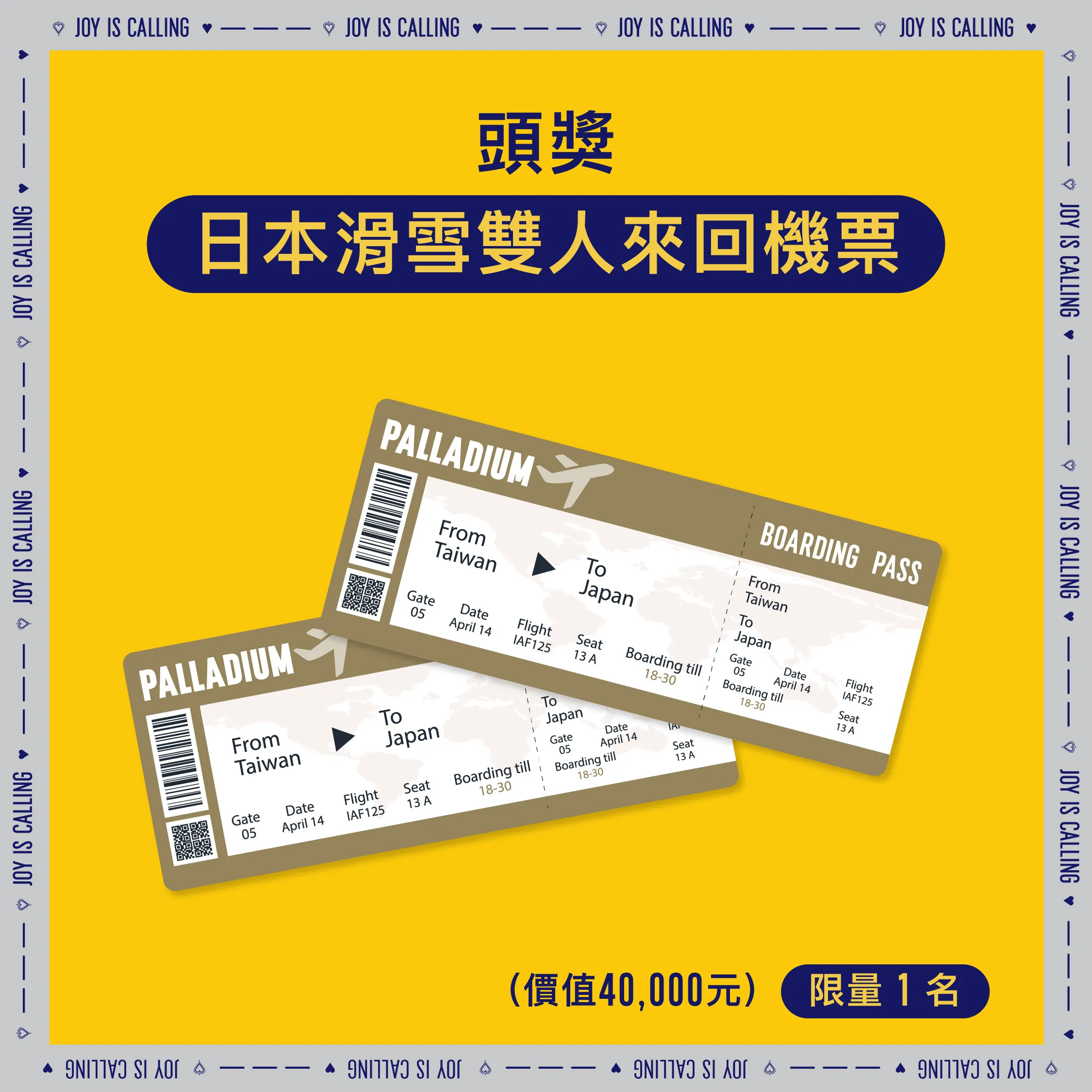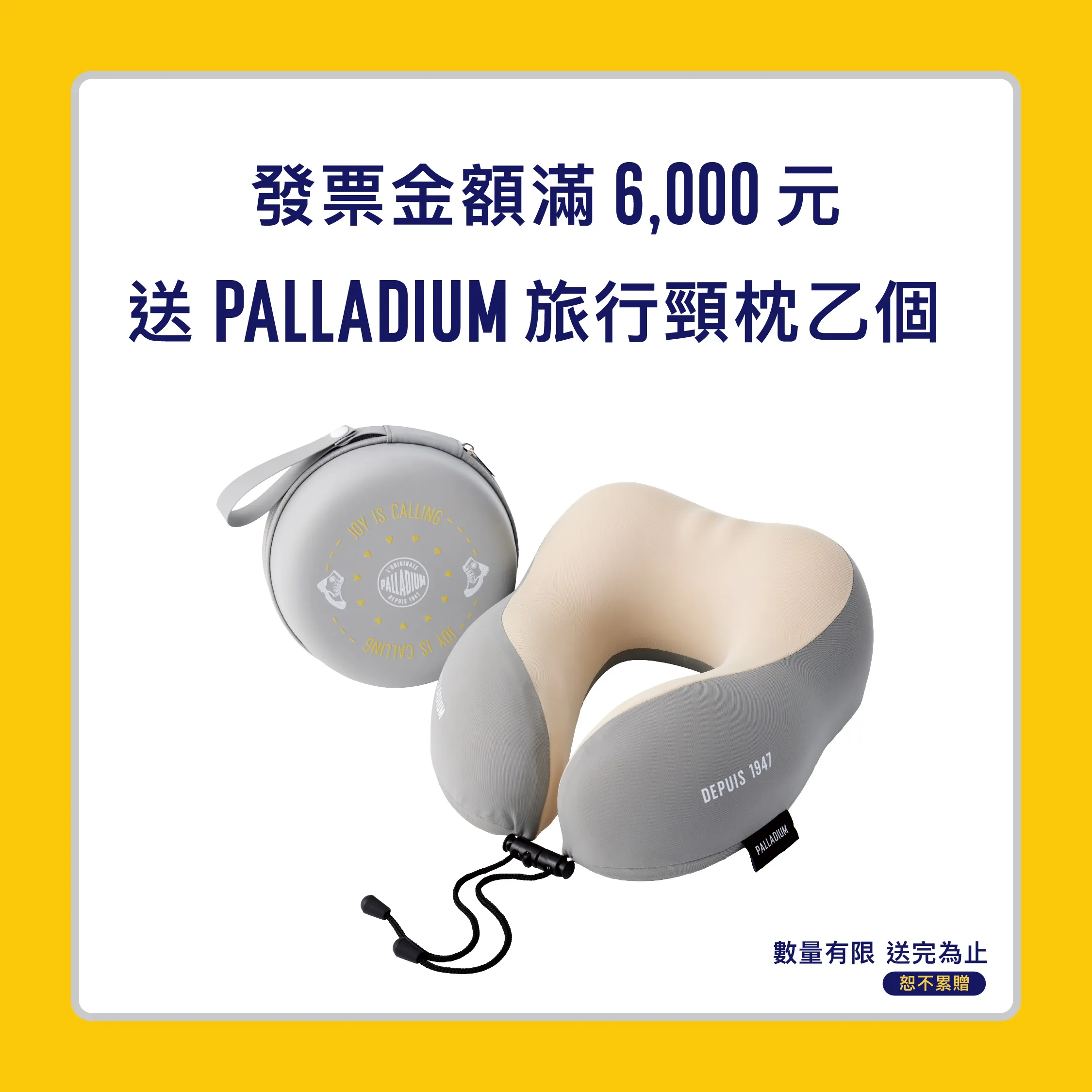 【注意事項】 (1) 全館正價商品、單一活動價鞋款、折扣優惠服飾配件皆可參與本活動。 (2) 本活動不可與VIP會員折扣、生日券、百貨聯名卡折扣、會員點數折抵及其他優惠活動合併使用。 (3) 滿額贈活動累計疊加計算,惟每檻贈品單筆限贈乙份,恕不重複贈送。贈品以現場實物為準,數量有限,送完為止。 (4) 日本滑雪雙人來回機票得獎者可獲得易遊網旅遊憑證,此憑證限本人使用,可兌換易遊網平台配合航空公司之日本地區全航線商品(廉航機票除外),且須於2027/2/28前向易遊網一次兌換完畢,抵用時恕無法找零,亦不可折換現金。 (5) 抽獎規範: .抽獎資格:凡於活動期間消費不限金額,並於3/3活動截止前成功線上登錄者即可參加。 .中獎公告:2026/3/6 起公告於 PALLADIUM 新春召集令活動網站,得獎者須於2026/4/6前完成領取,逾期視同放棄中獎資格。 .領獎須知:請保留發票正本(需載有購買PALLADIUM產品之明細)以供中獎時兌獎使用。發票經檢驗不符活動辦法或經變造偽造者,將取消中獎資格,抽出之獎項將不遞補。 (6) 贈品兌換:本活動僅限居住於台澎金馬地區之本國成年自然人參加,旅遊憑證寄送範圍亦僅限上述地區,PALLADIUM 萬元購物金與法國原創系列背包獎項限於PALLADIUM直營門市兌換使用,活動網站之贈品圖片為示意圖,僅供參考,贈品則以實品為主,恕不指定顏色及款式、轉讓或要求折換現金或其它商品。 (7) PALLADIUM BOOTS TAIWAN保有最終修改、變更、活動解釋及取消本活動之權利,若有相關異動將公告於官方網站,恕不另行通知。