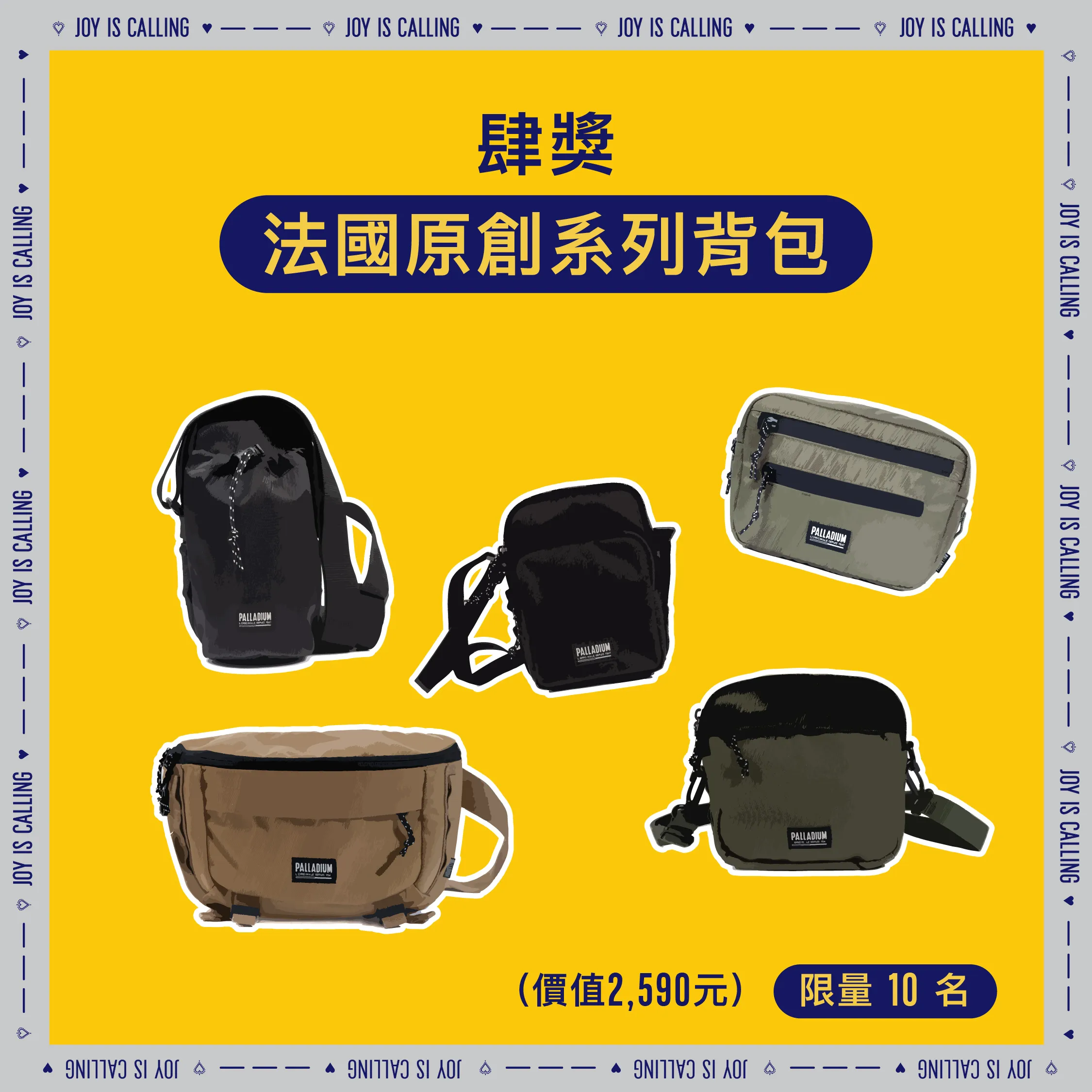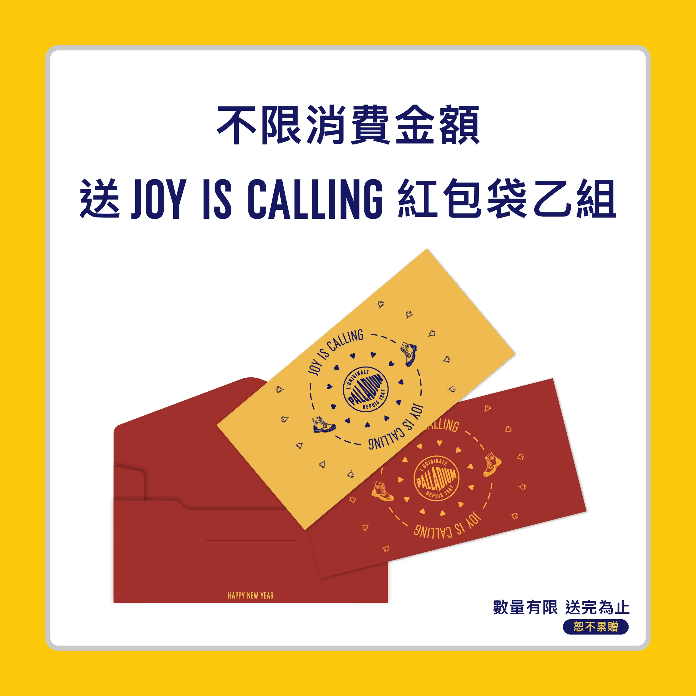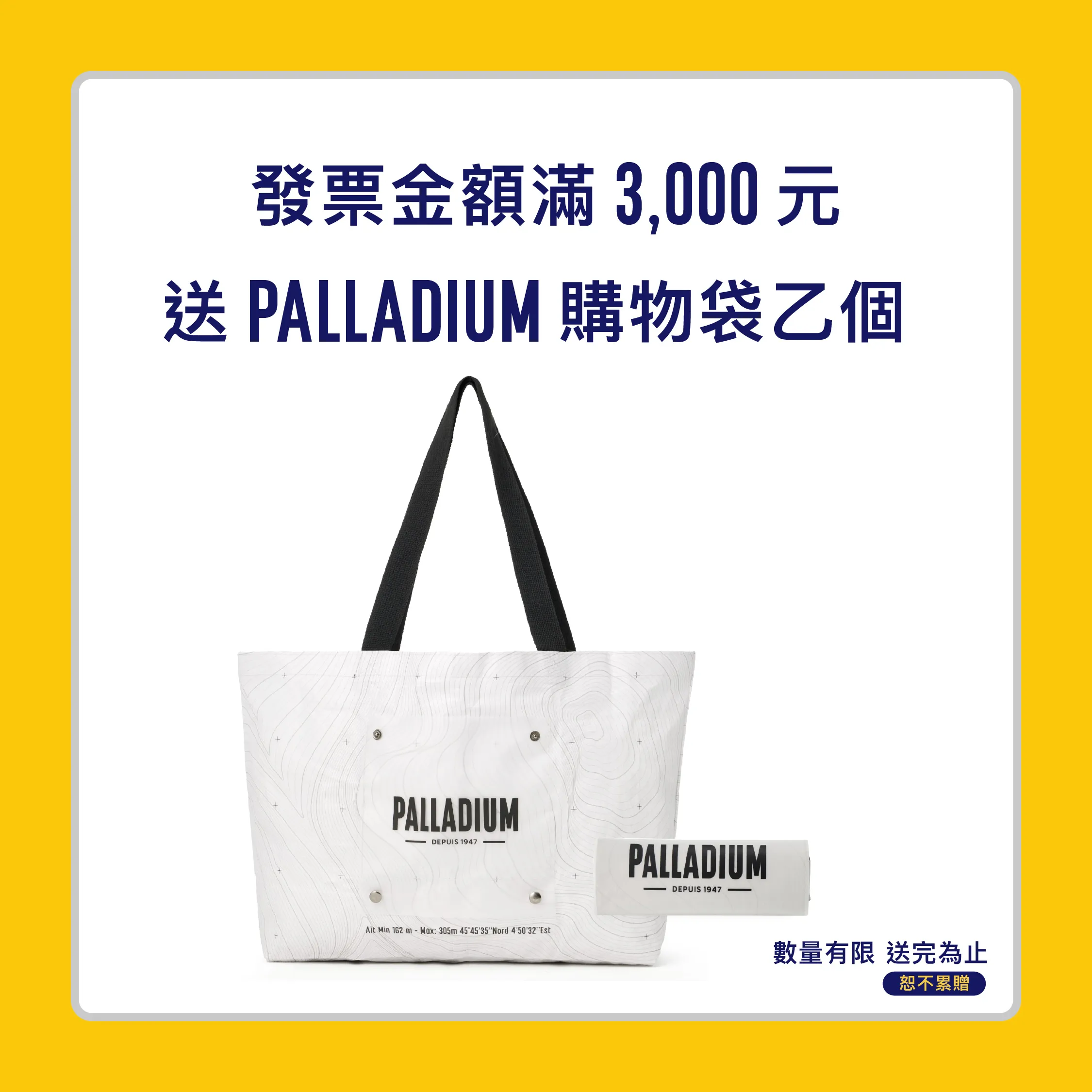 【注意事項】 (1) 全館正價商品、單一活動價鞋款、折扣優惠服飾配件皆可參與本活動。 (2) 本活動不可與VIP會員折扣、生日券、百貨聯名卡折扣、會員點數折抵及其他優惠活動合併使用。 (3) 滿額贈活動累計疊加計算,惟每檻贈品單筆限贈乙份,恕不重複贈送。贈品以現場實物為準,數量有限,送完為止。 (4) 日本滑雪雙人來回機票得獎者可獲得易遊網旅遊憑證,此憑證限本人使用,可兌換易遊網平台配合航空公司之日本地區全航線商品(廉航機票除外),且須於2027/2/28前向易遊網一次兌換完畢,抵用時恕無法找零,亦不可折換現金。 (5) 抽獎規範: .抽獎資格:凡於活動期間消費不限金額,並於3/3活動截止前成功線上登錄者即可參加。 .中獎公告:2026/3/6 起公告於 PALLADIUM 新春召集令活動網站,得獎者須於2026/4/6前完成領取,逾期視同放棄中獎資格。 .領獎須知:請保留發票正本(需載有購買PALLADIUM產品之明細)以供中獎時兌獎使用。發票經檢驗不符活動辦法或經變造偽造者,將取消中獎資格,抽出之獎項將不遞補。 (6) 贈品兌換:本活動僅限居住於台澎金馬地區之本國成年自然人參加,旅遊憑證寄送範圍亦僅限上述地區,PALLADIUM 萬元購物金與法國原創系列背包獎項限於PALLADIUM直營門市兌換使用,活動網站之贈品圖片為示意圖,僅供參考,贈品則以實品為主,恕不指定顏色及款式、轉讓或要求折換現金或其它商品。 (7) PALLADIUM BOOTS TAIWAN保有最終修改、變更、活動解釋及取消本活動之權利,若有相關異動將公告於官方網站,恕不另行通知。